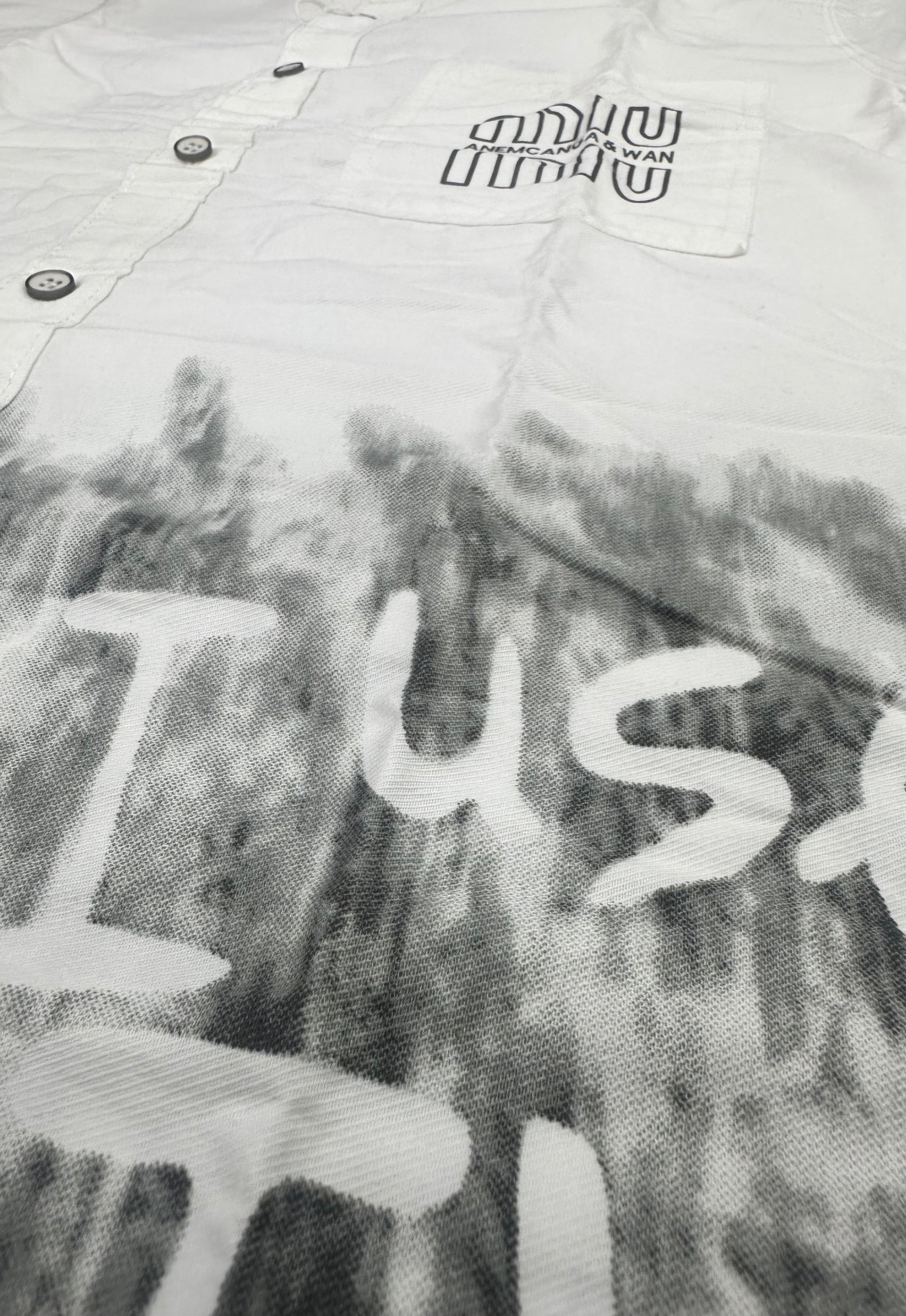 A crisp white cotton base meets an abstract grey street print — made for men who like clean, confident looks with designer-like finish.